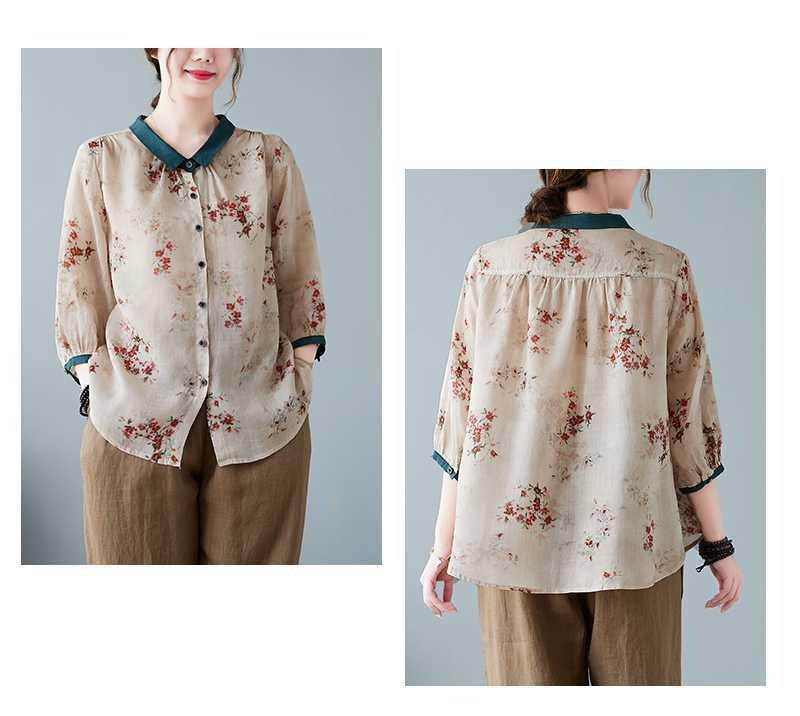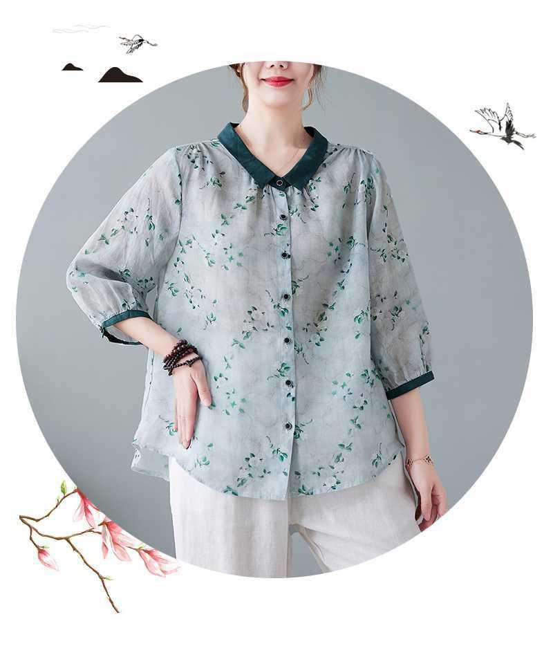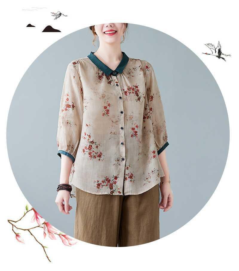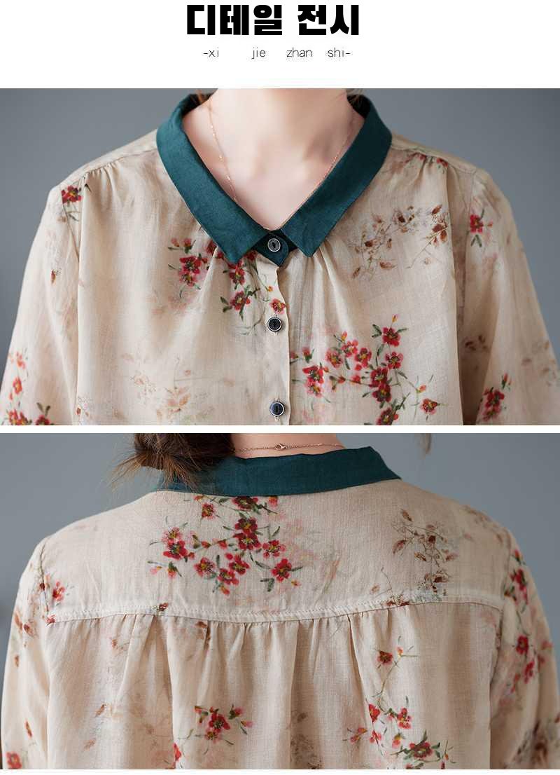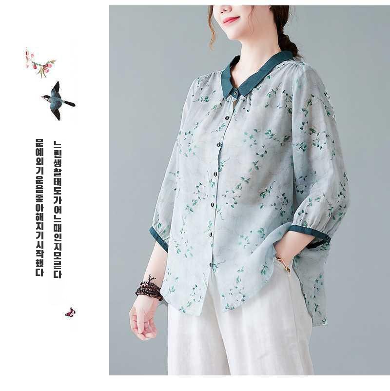 면마 프린트 셔츠 뚱뚱이 여동생 빅사이즈 여성복 칠부소매 셔츠 넥 감령 상의